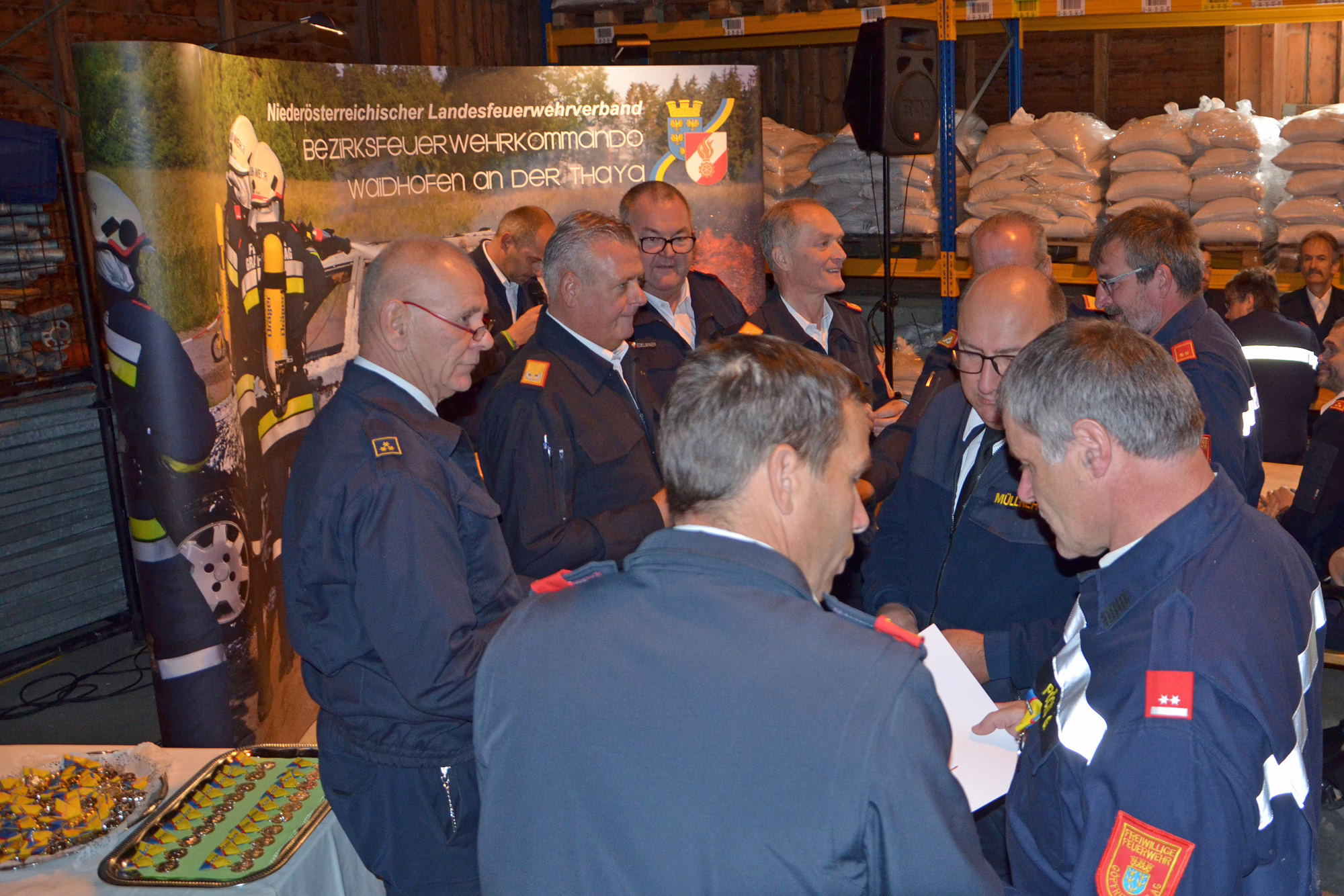 Landesfeuerwehrkommandant Dietmar Fahrafellner, Bezirksfeuerwehrkommandant Manfred Damberger sowie dessen Stellvertreter Kurt Liball überreichten die Auszeichnungen persönlich an die anwesenden Einsatzkräfte. Die Katastrophenschutzhalle war während des Hochwassers ein logistisches Zentrum: Ein Großteil der Sandsäcke wurde dort befüllt und anschließend zu den zahlreichen Einsatzstellen im gesamten Bezirk transportiert.