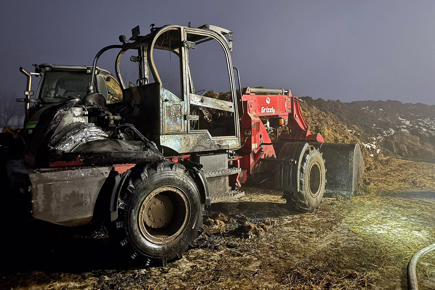 Gegen 18 Uhr bemerkte der Landwirt den brennenden Radlader und verständigte die Feuerwehr. Die Flammen schlugen aus dem hinteren Bereich des Fahrzeuges, nur knapp neben Heu, Stroh und den im Stall untergebrachten Tieren.
