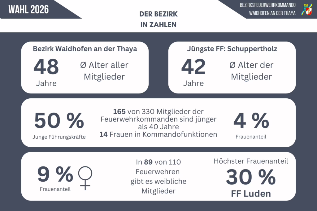 Die Zahlen verdeutlichen: Die Feuerwehren im Bezirk Waidhofen an der Thaya sind auf einem guten Weg, sowohl junge als auch weibliche Mitglieder stärker einzubinden. Engagement und Verantwortungsbewusstsein ziehen sich durch alle Altersgruppen – eine wichtige Grundlage für die Zukunft der Einsatzorganisationen.